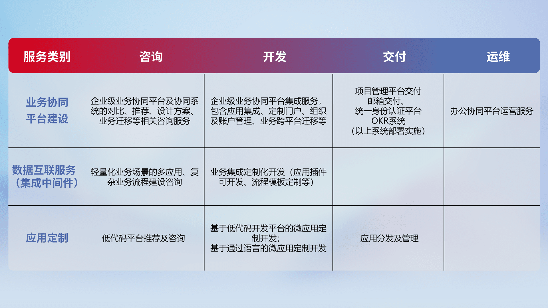 针对钉钉、、企微、、IDaas等平台级产品提供产品的规划、、方案、、交付、、定制化开发等服务,,,,实现如统一协同办公、、、智能客户服务、、混合会议管理、、智能数据查询、、等业务场景,,,实现数字化转型。。。。